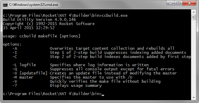 ccBuild is a command line utility you may use to create and build a content collection. ccBuild creates and builds a content collection by executing instructions in a makefile. However, ccBuild, first, validates the structure and content of the makefile against the makefile.dtd before it executes any makefile instructions and processes any documents. If the makefile fails the validation, ccBuild will report the error and will abort the build process. For more information on the makefile and DTD see subsequent topics in this section. Figure 7 shows the command-line usage for ccBuild