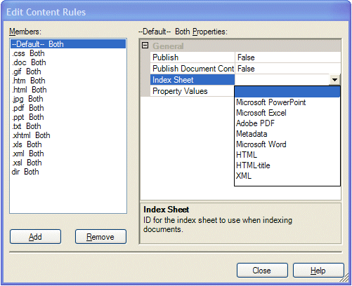 When you select a document type in the Members list of the Edit Content Rules dialog, the Index Sheet rule identifies what index sheet to use for indexing the documents of corresponding document type. You can associate only one index sheet per document type. Figure 4 shows the Index Sheet property drop-down list that contains the index sheet values from the Index Sheet property of the content collection builder properties.