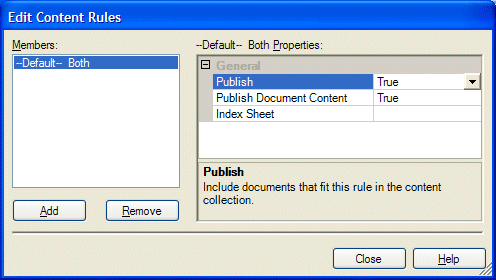 The content rules of Publish, Publish Document Content, and Index Sheet are the same for all collection builder nodes. However, with the ODBC Content Bridge does not rely on document types to know how to handle your ODBC database content. The only rule is the default rule for the entire collection, which you see in the "Members" box of the dialog. You are not able to add more document types with the ODBC Content Bridge. You can select one index sheet from the Index Sheet property drop down box to index your database content.