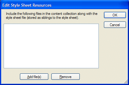 You can add the necessary additional resource files by clicking the Add file(s) button at the bottom of the dialog box. This will open a window for you to browse to the location of the file. When you find the file and click Open the path and name of the file will be added to the dialog box. When you build this content collection the ODBC Content Bridge will copy those files into the same folder in your content collection as your style sheet.