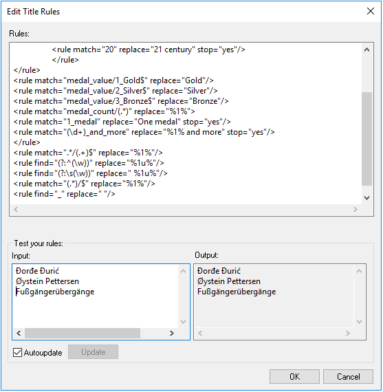 To process umlauts and other non-Latin characters correctly, you need to change the regular expression in the default title rules. Instead of <rule find="\b(\w)" replace="%1u%"/> , use the following two rules: <rule find="(?:^(\w))" replace="%1u%"/> and <rule find="(?:\s(\w))" replace=" %1u%"/>.