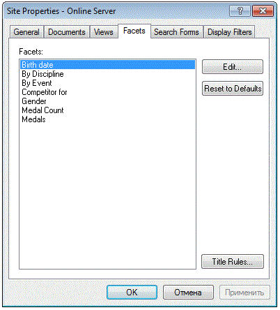 The list of facets on the Facets tab is an auto-collected list from all infobases that are mounted. Figure 1 shows the list of facets for the Olympic Medalists content collection.