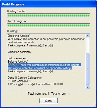 If your library's output and the SDF reference directories are the same, this means that the SDF that controls the structure of your site "looks" for your library collections in your library's output directory. If this is the case you must take your collections offline in the Content Network Manager (and save the changes) to execute a rebuild in the Library Manager. If you do not take the collections you want to rebuild offline, the Library Manager will be unable to rebuild those collections and will produce the error in the Build Progress dialog you see in Figure 2.