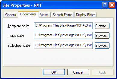 Default Page designates the page that is displayed in the document view area when you first access your NXT site. Typically this is an HTML document, however, you can change this to any document (and document type) you desire. The default for this value is TitlePage.htm. Whatever document you choose to be your default page, you must place it in your Templates directory, not in a content collection or elsewhere on your NXT Online Server.