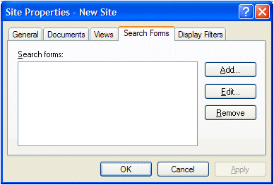 The Search Forms tab in Figure 5 enables you to register other search forms that you want to use on your site. Search forms that appear in this list box are recorded in the SDF and appear in the search and branding area on your site in the Choose search form drop down list. In using search forms, you do not need to register your search forms in this tab. You may have other methods for accessing search forms from your site interface. This too is acceptable.