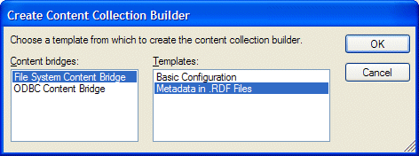 Most of this process is for adding external metadata to an existing content collection in your library. You can, if you know you already have external metadata or will have external metadata, start and build a new content collection builder node using the Metadata in .RDF Files File System Content Bridge template. Figure 4 shows this option.